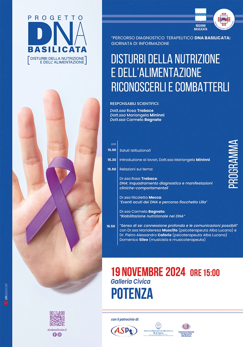 In questo contesto si inserisce il Progetto Regionale Disturbi della Nutrizione e dell’Alimentazione (DNA), che prevede la realizzazione di eventi formativi la cui realizzazione è affidata all’ASM di Matera.